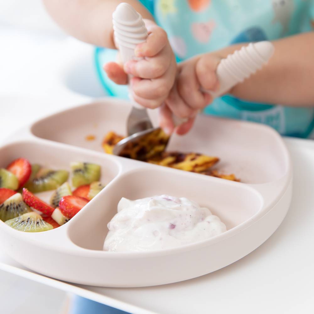 The Silicone Grip Dish from Bumkins suctions strongly onto surfaces and is great for little ones learning to self feed, or more experienced eaters using utensils.