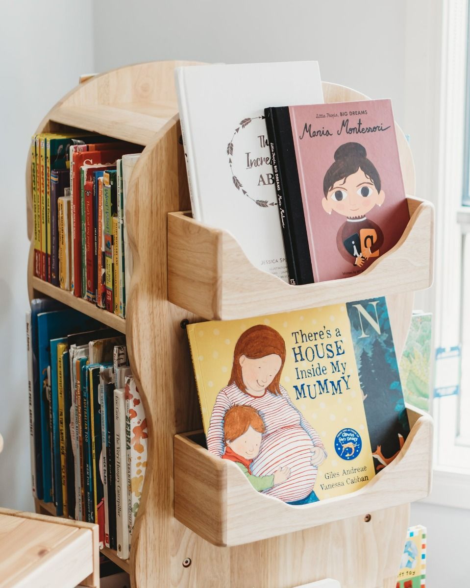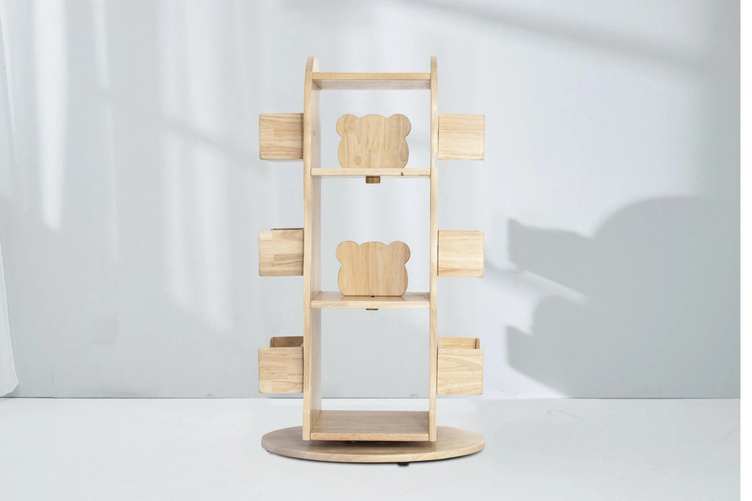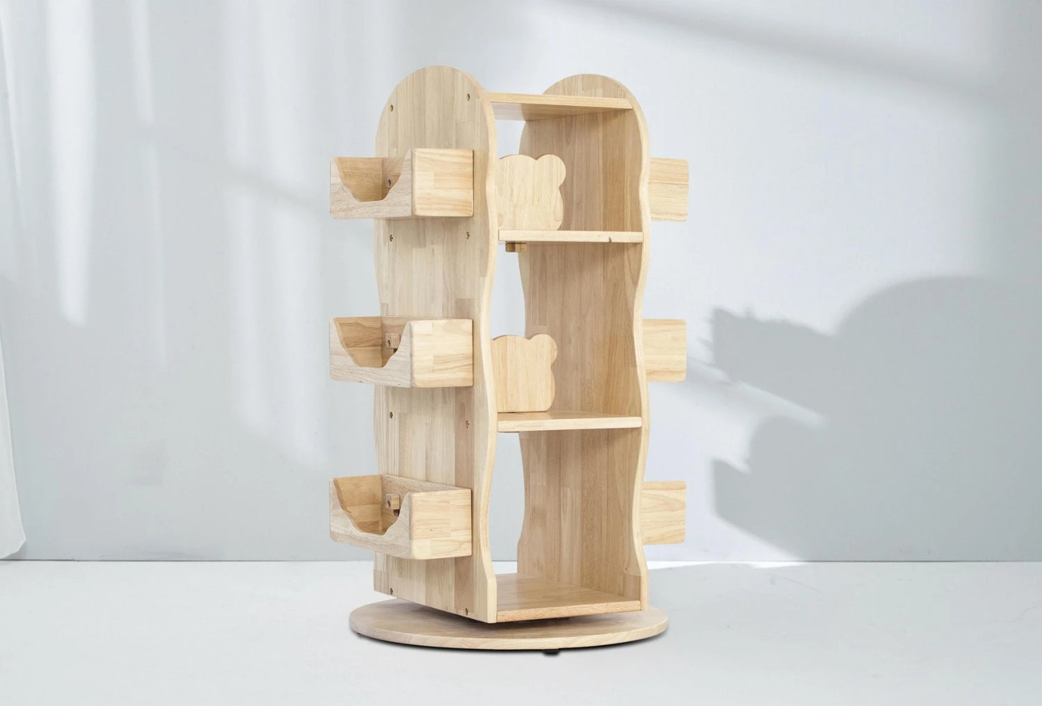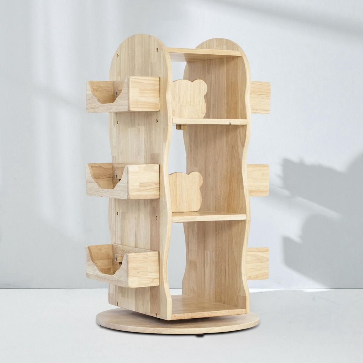 The solid wood bookcase rotates 360 degrees on a Lazy Susan and has three open shelves. Detachable bear-shape divider pivoted in the centre of the top two shelves offer many display options to engage your children while keeping things tidy and organised. Big and small books can be arranged spine out or covers facing out, upright or lying on the side, so a good read is always right at their fingertips.