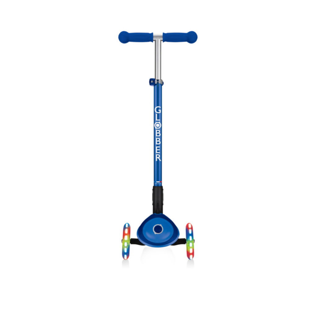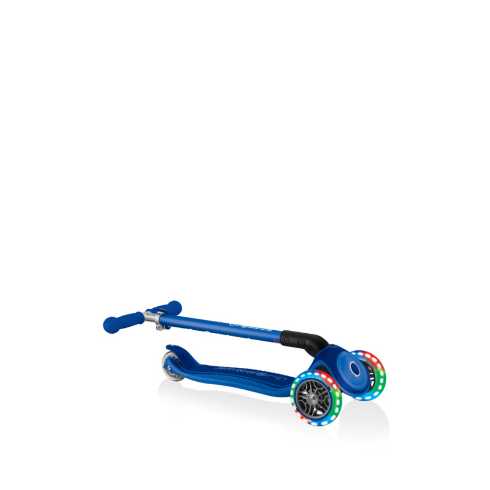 PRIMO FOLD PLUS LIGHTS 3-wheel kids scooter comes with Globber's patented steering lock button, which fixes the steering system of the two front wheels to only move forward and backward, helping children to learn how to balance on a scooter in no time!