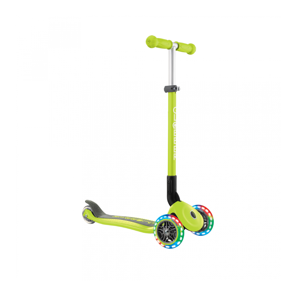FOLDABLE 3-WHEEL KIDS SCOOTER- PRIMO FOLDABLE LIGHTS is a 3-wheel foldable scooter for kids, thanks to Globber's patented folding mechanism with a push button; folding a scooter is fast & easy! With just a push of a button, you can easily fold up the scooter to carry it in trolley mode and conveniently store it away after playtime!