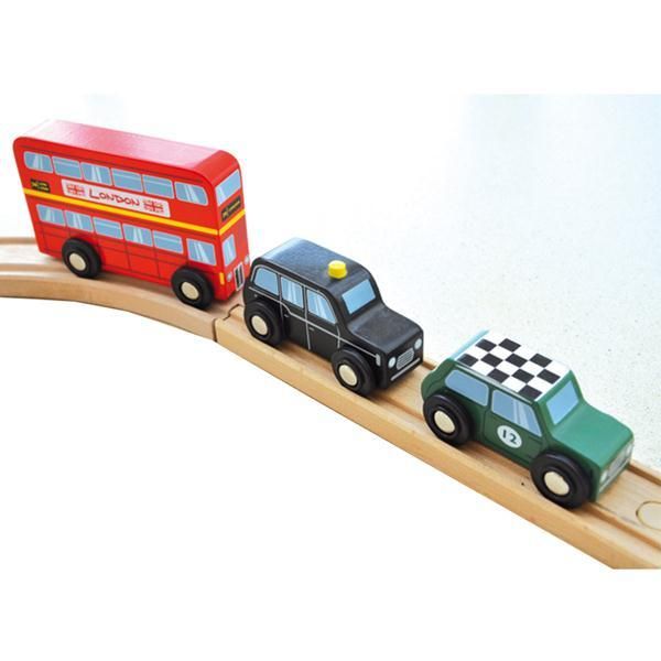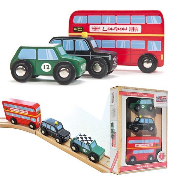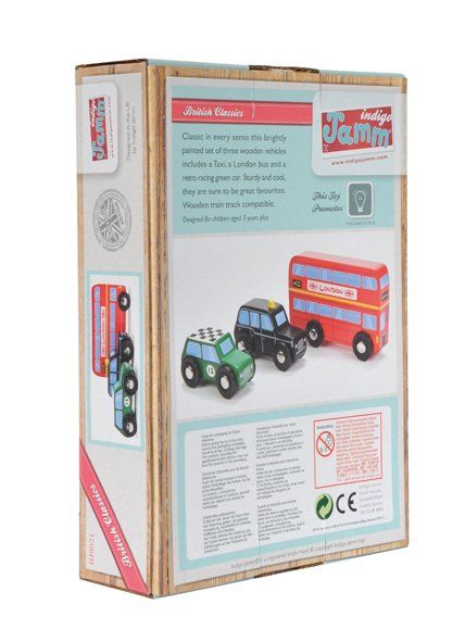 British classics in every sense this brightly painted set of three wooden vehicles includes a Taxi, a London bus and an iconic racing green car. Sturdy and cool they are sure to be great favourites. Wooden train track compatible.