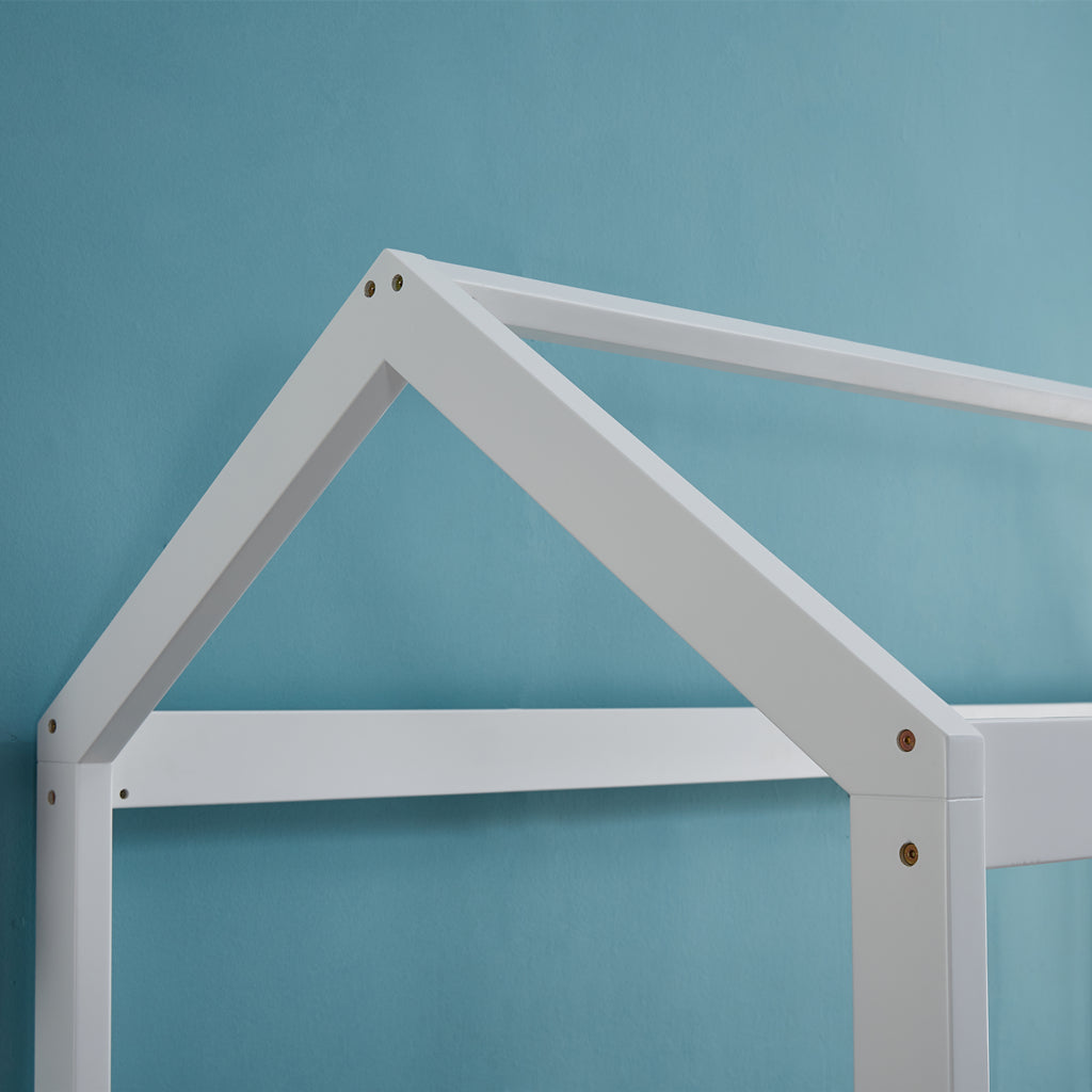 Strong and sturdy, the wooden house bed frame comes with a durable plywood slated base, reinforced angled brackets for long term support, stylish headboard, heavy-duty steel fixings and smooth edges all round. Finished in a non-toxic, eco-friendly white paint, the neutral-coloured wooden house Bed Frame makes for easy décor coordination with any bedroom.