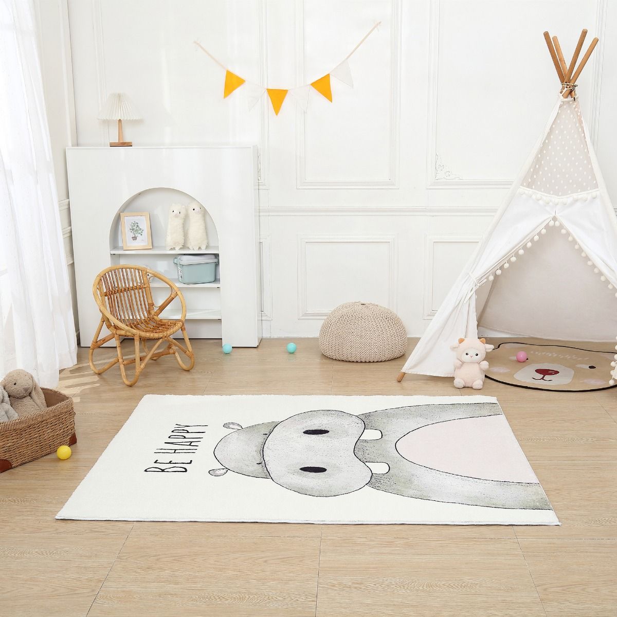 All 4 Kids Hippo Be Happy Rug is exclusively designed for ALL 4 KIDS. It offers a great comfortable space for kids to play and read. It's about 1cm thick and comes with anti slip backing. It's a fantastic decoration for your kids room and will let it stand out.