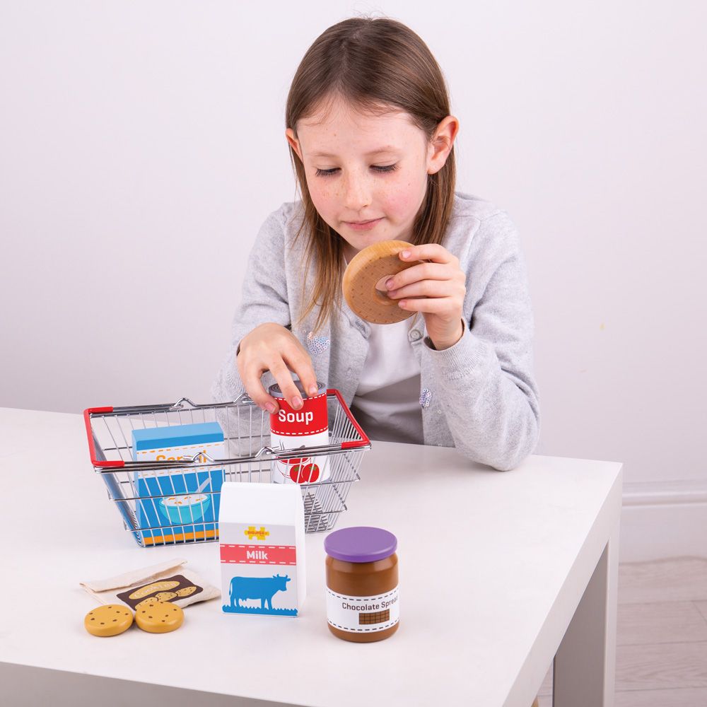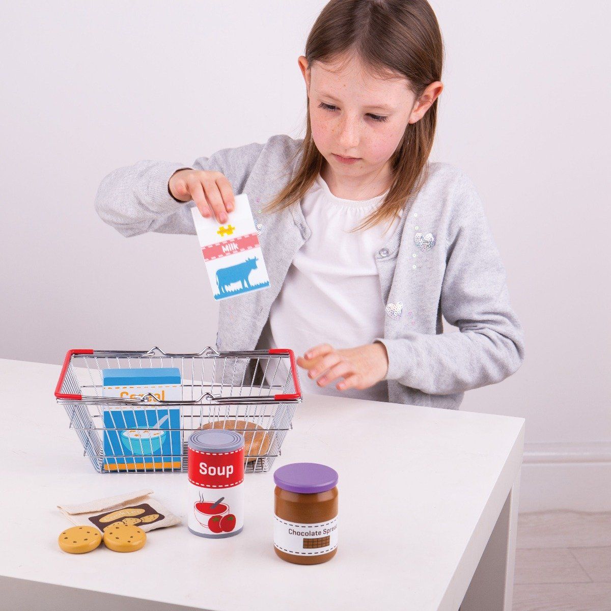 Pop to the shops with this realistic metal toy shopping basket and wooden groceries. Perfectly sized for little hands the basket is super comfortable to carry and sturdy enough to carry all your groceries. Includes wooden milk, cereal, soup, cookies, chocolate spread and bread. The sturdy handles fold flat for easy folding or stacking. A great addition to any play kitchen or shop. A great way to encourage creative and imaginative role play. Made from high quality, responsibly sourced materials. Conforms to current European safety standards. Age 3+ years.