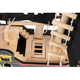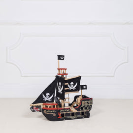 Sail the seven seas with this impressive Barbarossa pirate ship. All aboard a classic, award-winning wooden toy boat. Painted in striking black, with billowing fabric sails and adorned with a traditional skull and crossed swords' motif for an authentic look and feel. Full of fun features to discover, including;