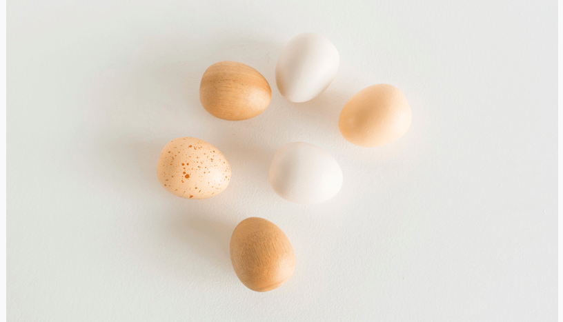 • Set of 6 wooden rubber eggs in an egg crate