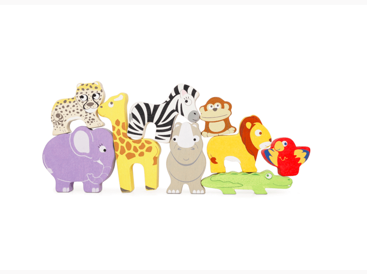 This adorable set features 9 wild wooden African animals and a drawstring bag for on the go play. Children will fall in love with the giraffe, lion, elephant, zebra, monkey, rhino, cheetah, crocodile, and parrot.