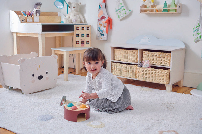 An adorable wooden hammer game for little one's that love to BANG with a hammer. Designed like a tree trunk little hands use the woodpecker hammer to bash the four coloured balls through the stump. Great for building fine motor skills, colour recognition and learning cause and effect.