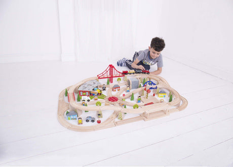 We have kids’ train track sets in various styles, including mountain railway train set, safari train set, wild pines train set, city set, treetops train set, farm train set, and more. Each is designed with multiple pieces, magnetic connectable train carriages, train platforms, buildings, and a lifting bridge.