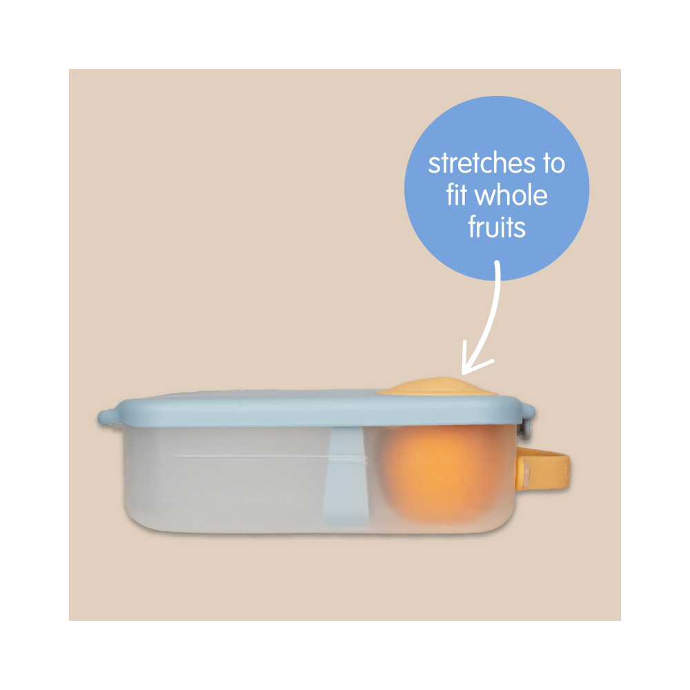 Its unique flexi whole fruit holder lets you store a whole apple, as the stretchy seal bends around the shape of your fruit – no need to cut fruit into smaller sizes! Leak-proof silicone seals lets you store wet foods like watermelon and yoghurts (no liquids).