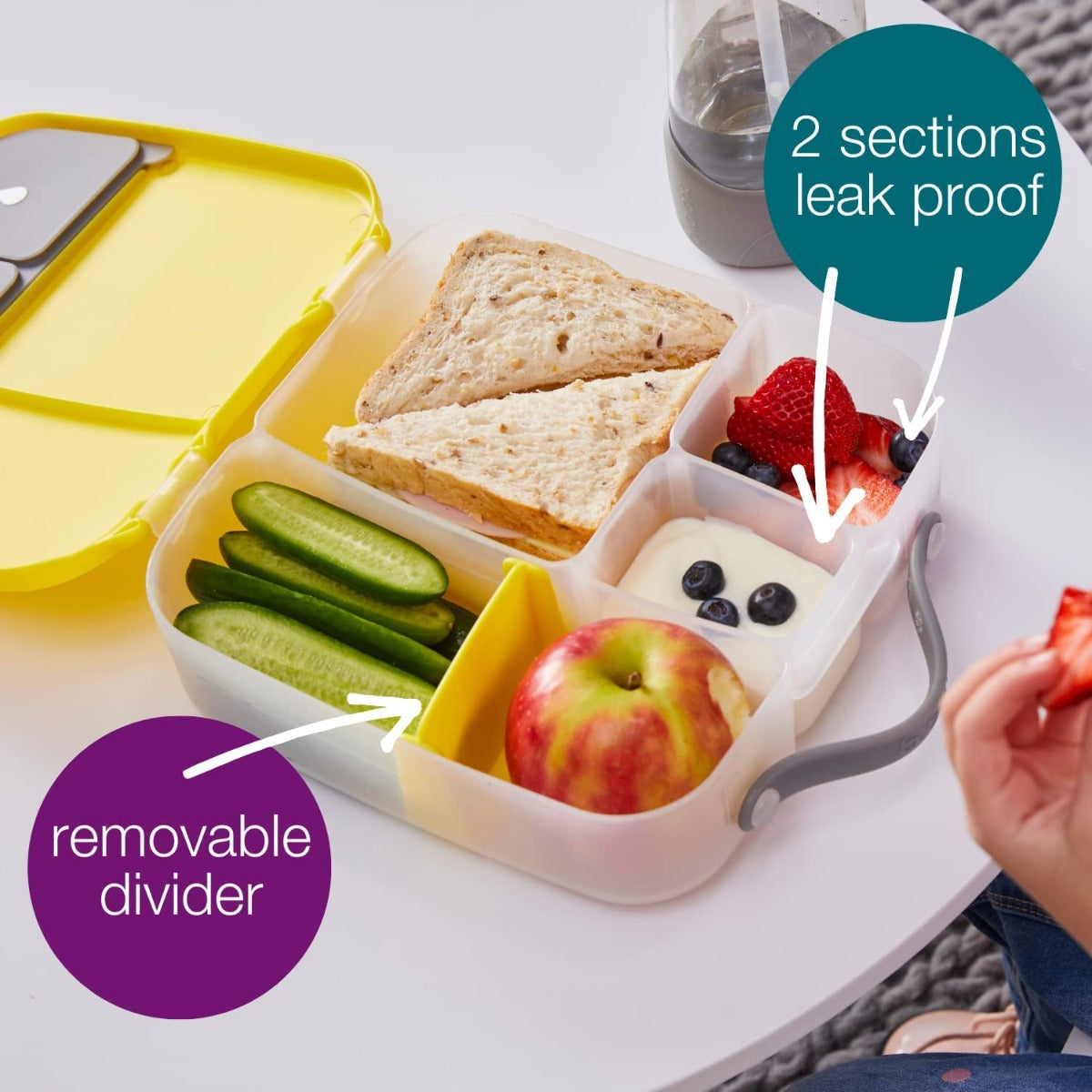 The custom divider slides across enabling parents to adjust the compartment size as they need, or remove it to fit a whole banana or wrap.