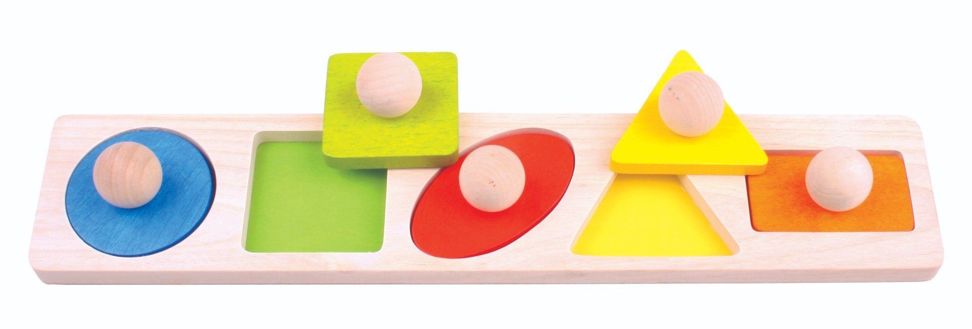 - Consists of 5 pegged puzzle pieces. Ages 1 year and up.