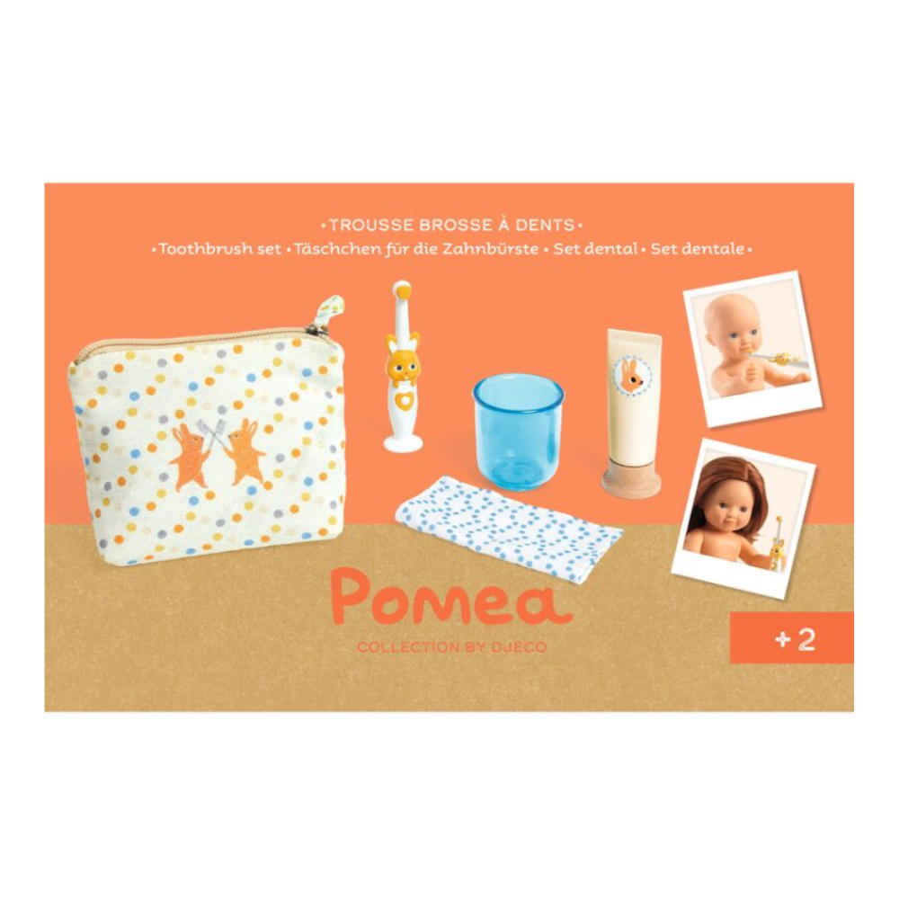 This adorable 5-piece doll toothbrush set is perfect for encouraging imaginative playtime! The set includes a cute toiletry bag decorated with bunnies to store all the doll's dental care essentials. The bag holds a pretend toothpaste tube, a toy electric toothbrush, a small cup, and a tiny towel. This FSC® certified wooden toy set is designed for little hands and promotes healthy dental hygiene habits through pretend play. Suitable for dolls sized 28 to 34 centimeters.