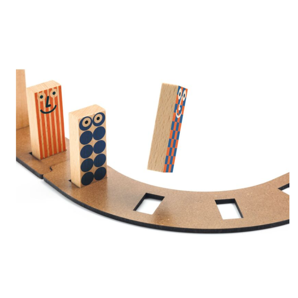 Recognized by the Selection of Ludolibrarians for its creativity and educational value, the Junior Racer set is a wooden chain reaction, puzzle and construction game for children aged 5 and over. Children copy the 3 designs in the instructions booklet to build the courses, or they can make up their own - the possibilities are endless. Highlights in the box include the wacky car and funny Zig domino characters.