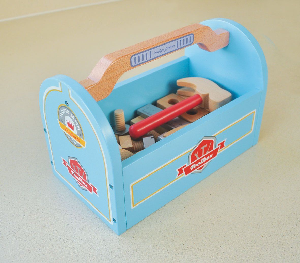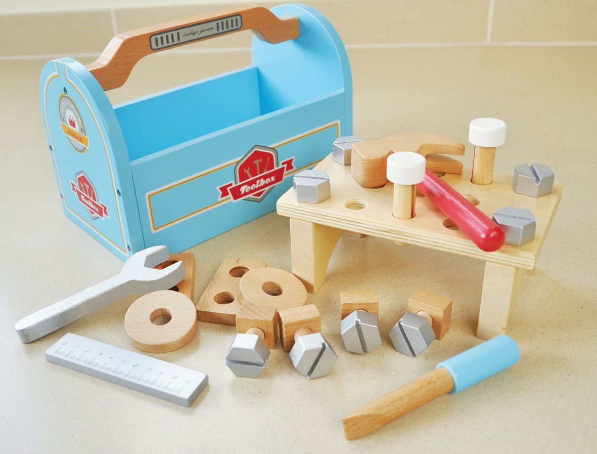 A lovely pretend toolbox for all those imaginative play jobs to do around the house. Comes complete with 4 tools and 21 pieces. A wooden hammer, screwdriver, spanner and parts to make a small workbench.