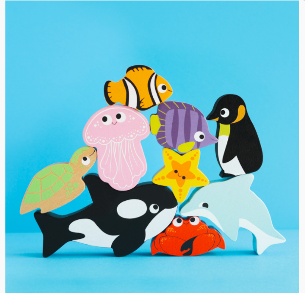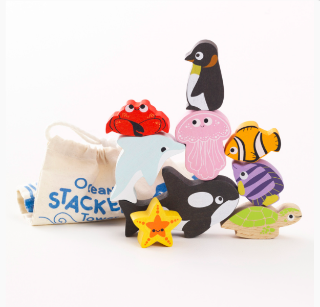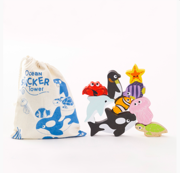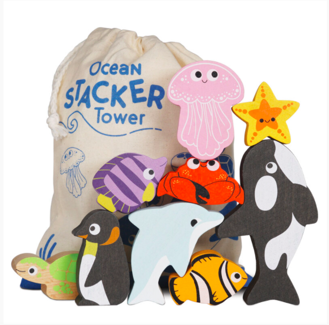 Are you ready for an adventure under the sea? This adorable ocean stacker set contains 9 aquatic animals that can be balanced into towers or used in imaginative open-ended play. The animals are made from sustainable FSC wood and decorated in safe water-based, chip-resistant paints. The set comes packaged in a cotton bag making it great for on-the-go play. The animals featured include;