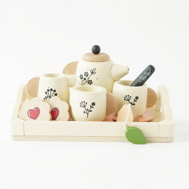 This 12-piece set includes everything your little one needs to host their own delightful tea party. It features beautifully crafted wooden cups and saucers, a charming teapot, a tea bag, a dainty milk jug, and even sugar-coated biscuits for an authentic tea-time experience. The serving tray is adorned with charming floral details, adding a sense of style to the convenience and portability of the set. All wooden parts are made of FSCTM-certified wood.