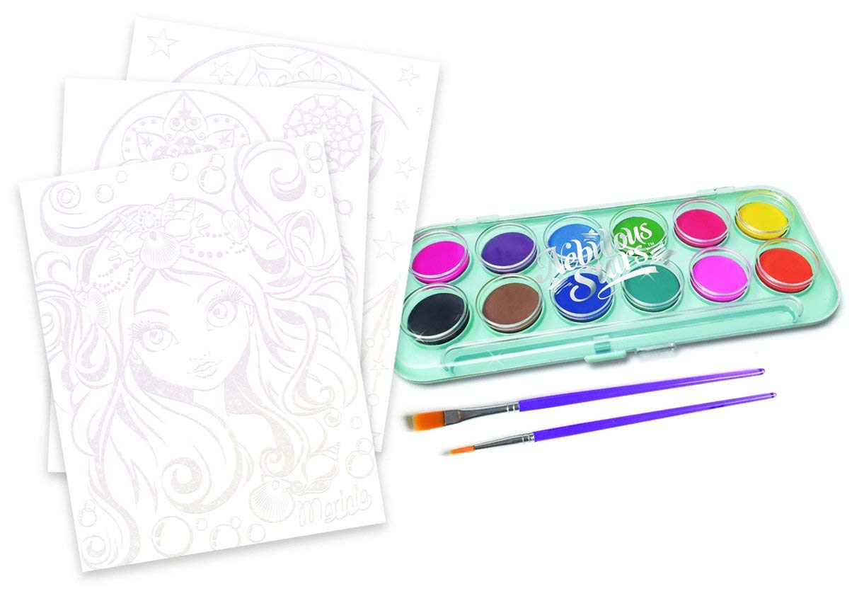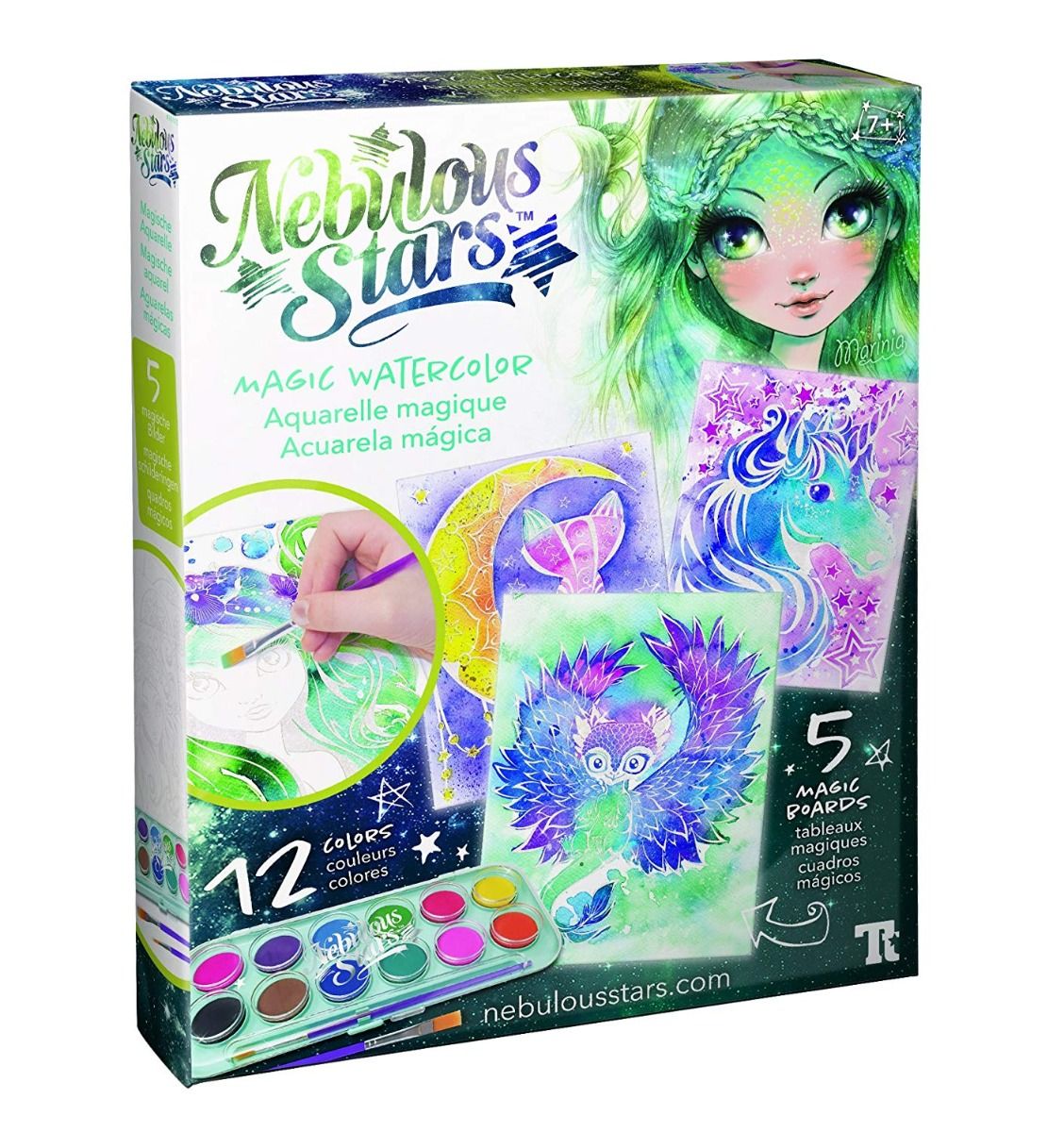 Contents: 5 magic watercolour boards, 12-colour watercolour set, 2 paintbrushes, colour instructions, Marinia's full story