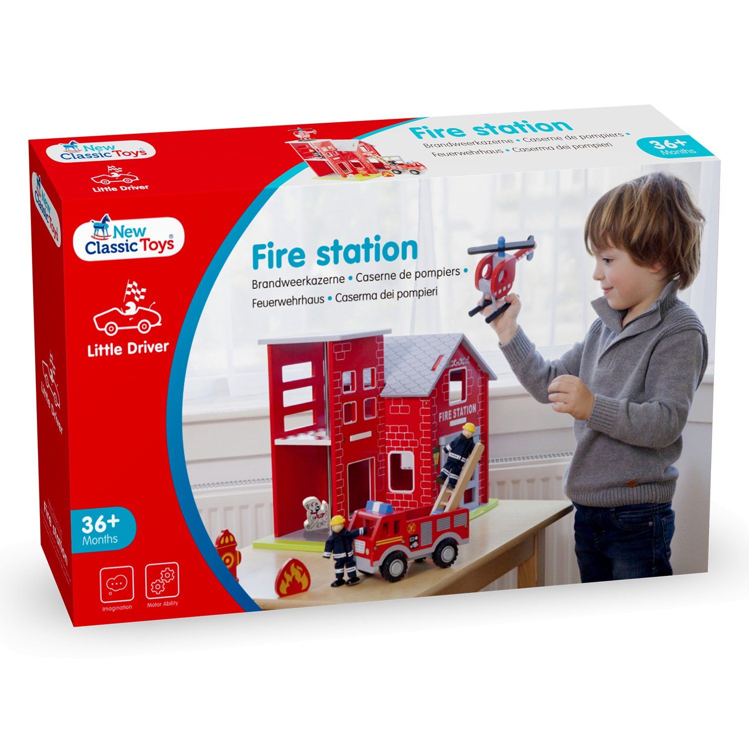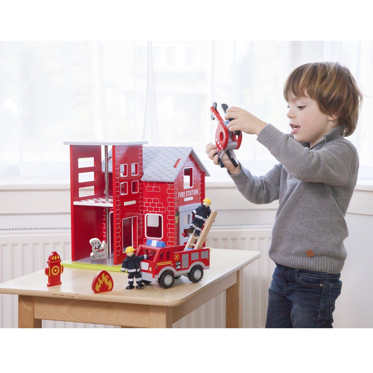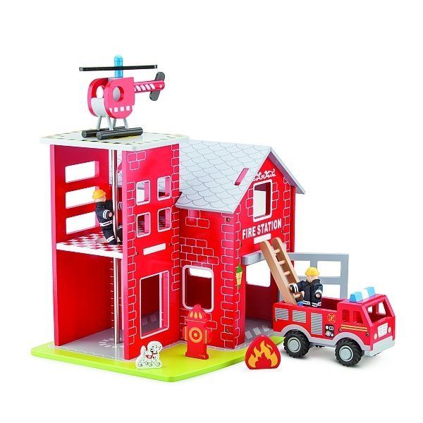 This comprehensive set includes a multi-story building, fire engine with rubber wheels and moveable ladder, helicopter with spinning blades, 2 poseable fire fighters, fire pole, fire hydrant,wooden flames and Spot the Station Dog. Roof lifts off for internal access and handy storage.