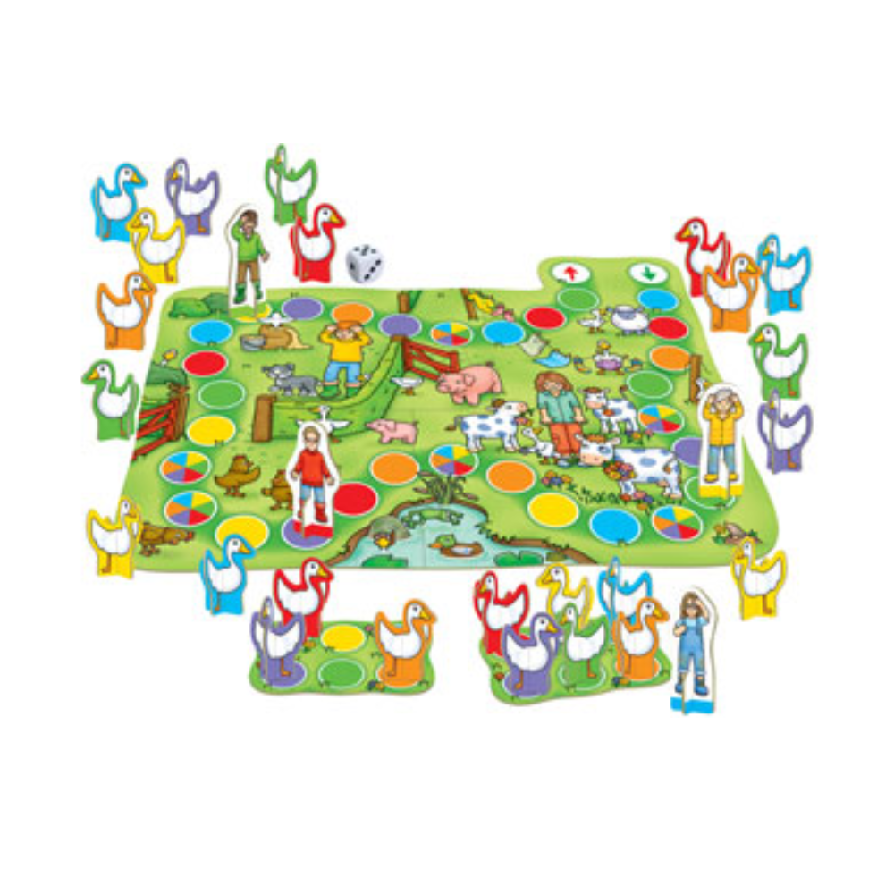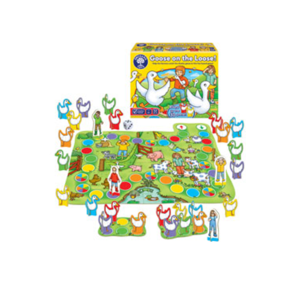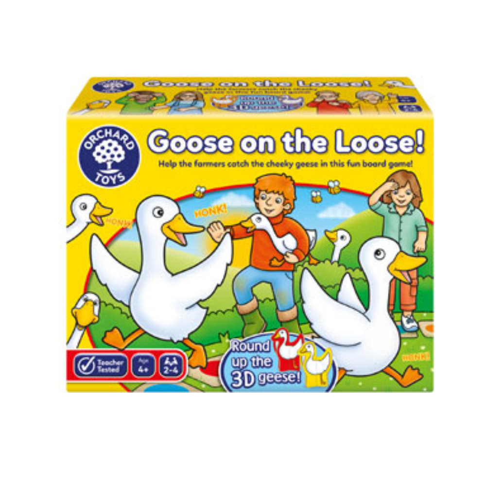 Watch out! There's a Goose on the Loose! Help the farmers round up the escaped geese in this fun family board game. This fun, family game features twenty-four 3D geese to collect. Each player is given a collection board and must roll the dice to make their way around the board rounding up the geese, shouting "Honk" whilst collecting their geese, but be careful your goose doesn't escape or you'll find yourself shouting "Goose on the Loose!". The winner is the player with the most geese on their board when everybody has finished the game.