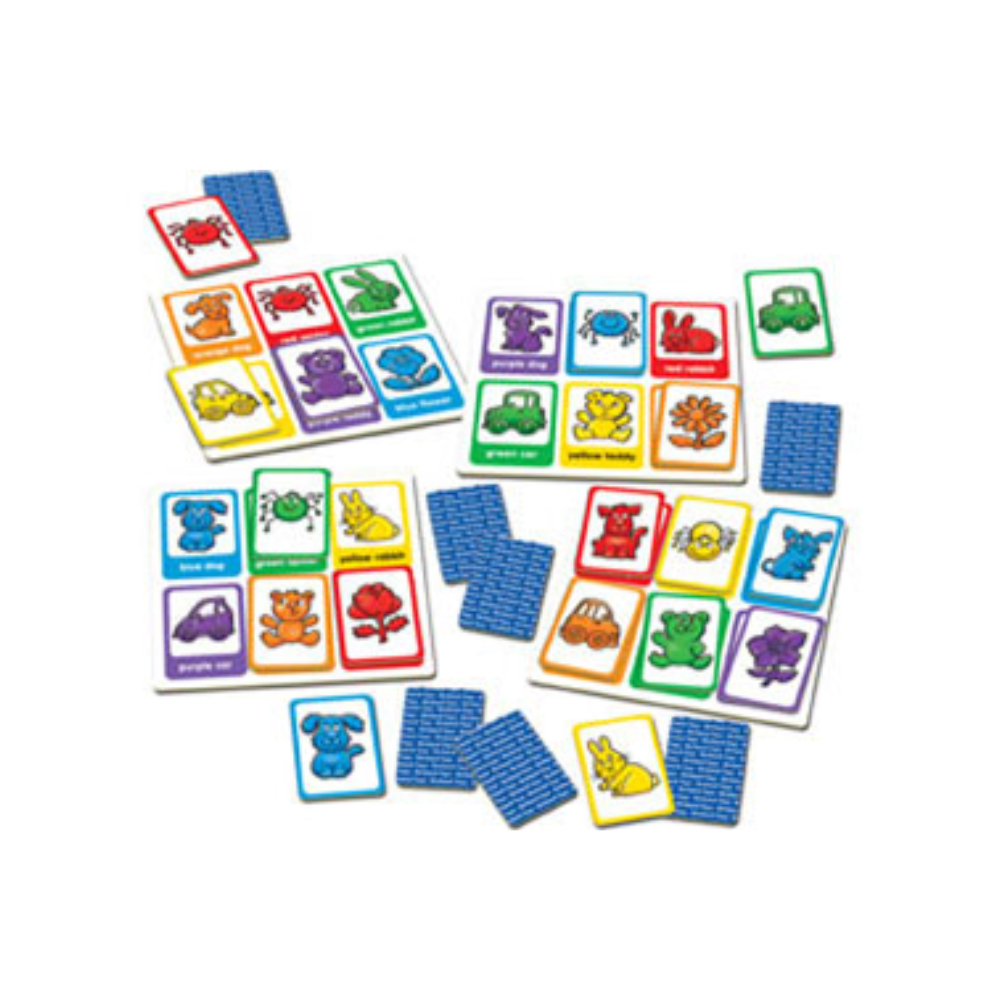 This first colour matching lotto game features fun and friendly illustrations of everyday characters and objects which children will recognise, from teddy bears to cars to bunnies. Played as a simple lotto game with each player having their own board, players are encouraged to match the bold coloured cards to the pictures on their board by both item and colour. The game features a variety of colours for children to learn and match, including red, blue, purple, green, orange and yellow. When playing with younger and older children, encourage older children to read the words of the colours aloud as well as matching the cards by colour and shape for an extra challenge.