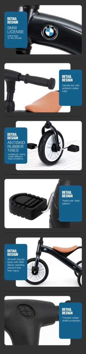 Crafted with a very strong steel structure and firm welding, this tricycle ensures durability that withstands the most adventurous playtimes. The stable triangle design provides excellent balance, while the safety anti-slip ABS tyres and anti-slip grips guarantee a secure ride on various terrains. Every detail, from the shining auto paint to the comfortable leather seat, showcases the high-quality craftsmanship synonymous with the BMW brand.