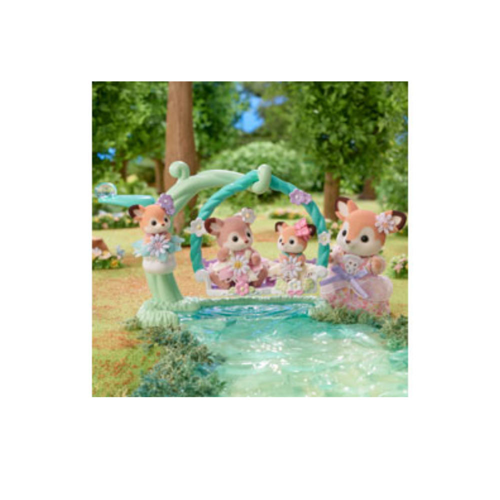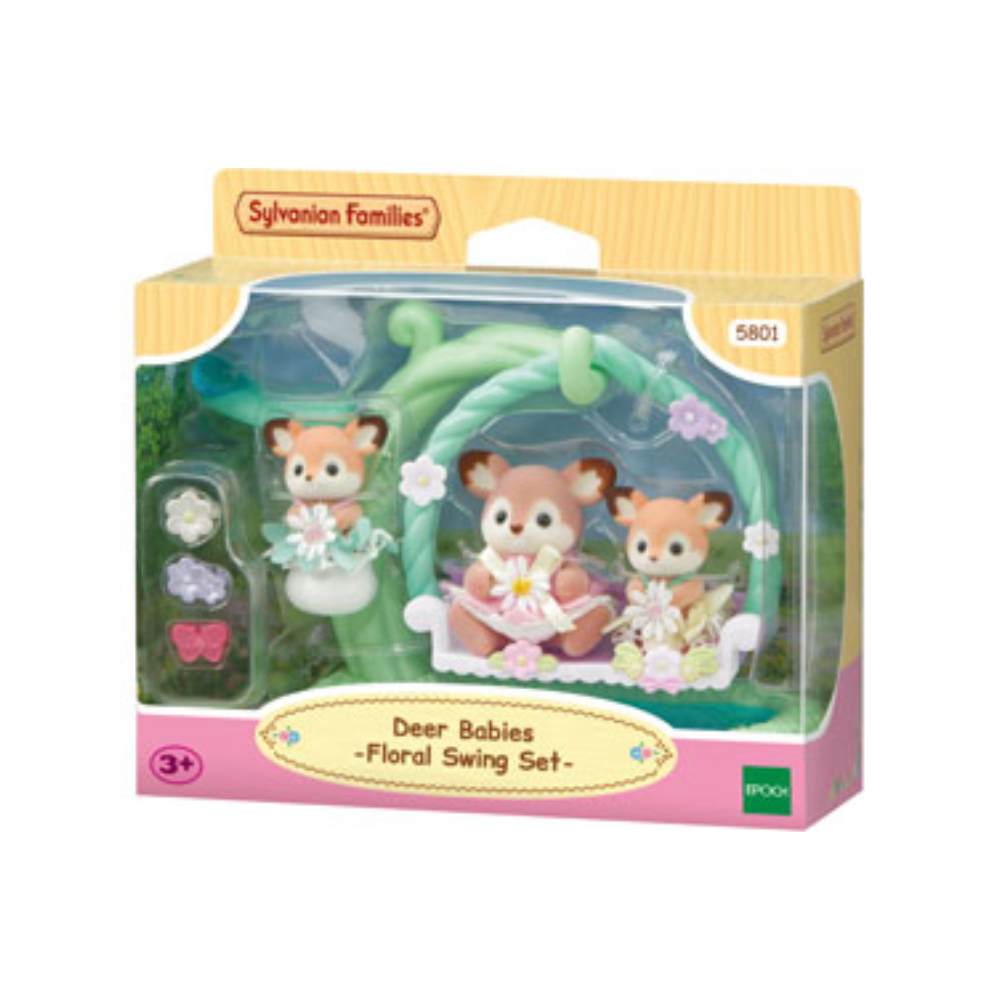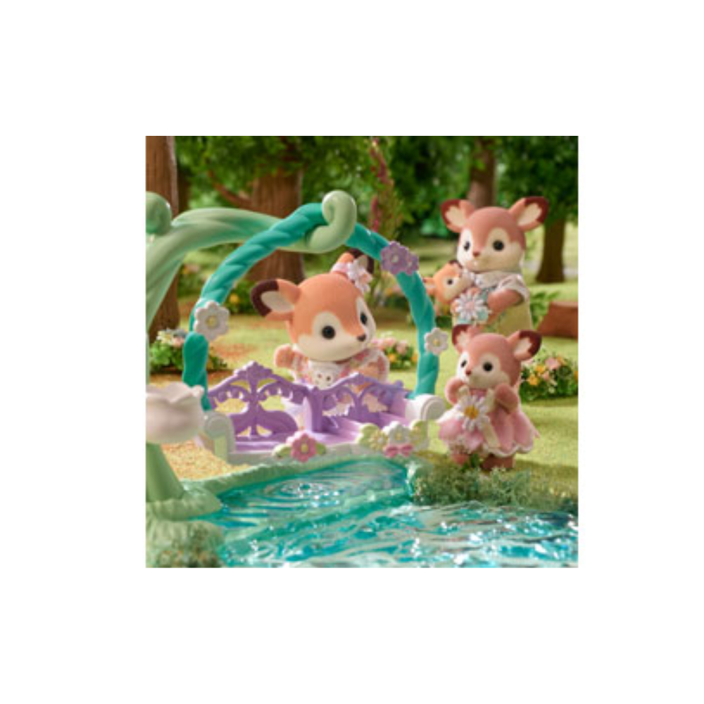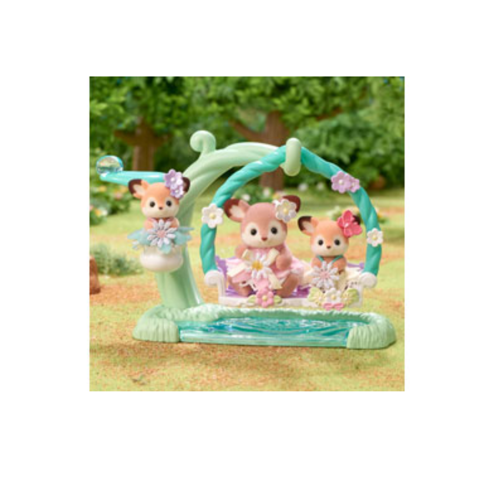 The set is a whimsical addition to the Deer Family (sold separately), and includes an ivy swing with a lily of the valley cradle and a leaf seat complete with a clear water droplet. Perfect for woodland adventures in Sylvania, the babies can relax by the water, swing in the ivy, or nestle in the lily of the valley cradle.