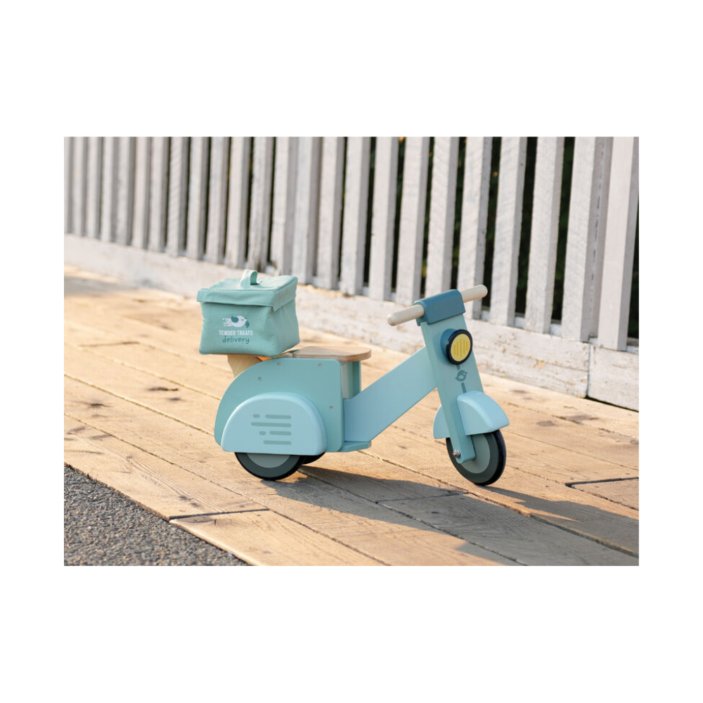 Introducing a speedy-looking delivery scooter, perfect for transporting all kinds of pretend takeaway food! With a canvas bag on the back, you can fill it with delicious items like pizza and hot chocolates to deliver to your friends. The set also includes a cardboard takeaway menu for extra playtime fun, enhancing the experience. This toy is great for pretend play and helps develop social and language skills.